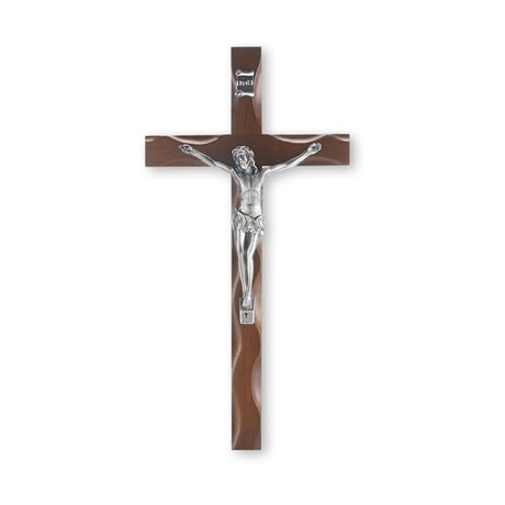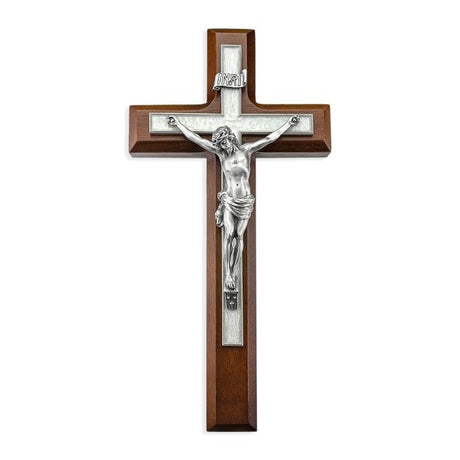 10" Walnut Wood and Pearlized Cross with a Pewter Corpus and Wedding Rings