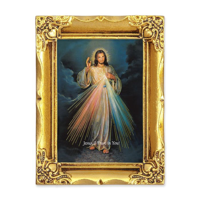 4 1/2" x 3 1/2" Antique Gold Frame with a 2 1/2" x 3 1/2" - Sacred Heart Gold Stamped Print-P65 is backordered and will ship as soon as it is back in stock.