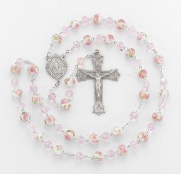 White and Pink Glass Flower Bead New England Pewter Rosary.