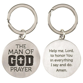 Keyring is made of zinc alloy. The front side displays: The Man of God Prayer; the back reads: Help me, Lord, to honor You in everything I say and do. Amen. Size is 1-3/8 inches diameter.