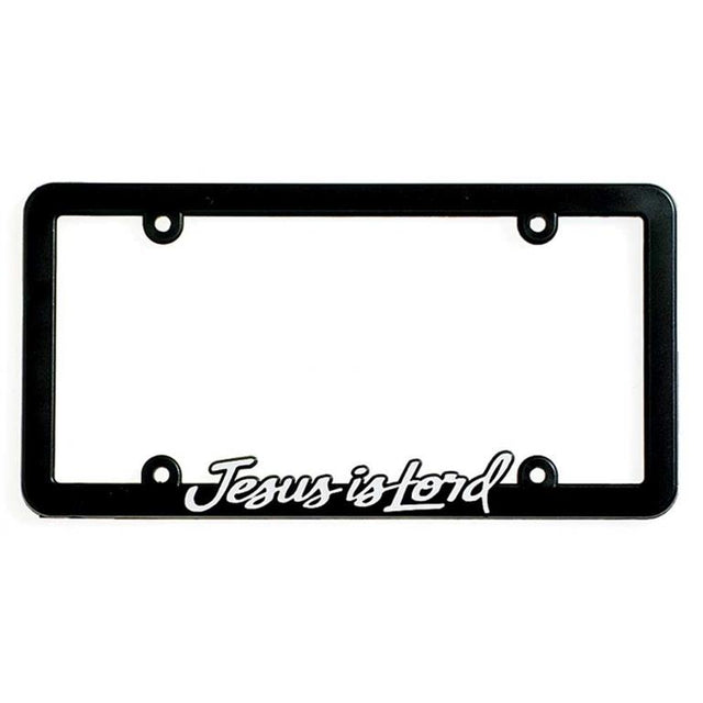 License plate frame with text: Jesus is Lord. Made of high impact polystyrene. Size 13x3.