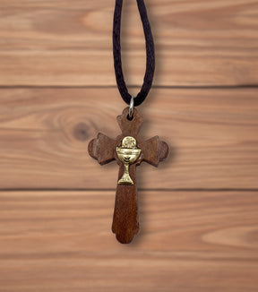 VARIETY OF NECKLACE WITH WOOD CROSSES - CROSS WITH CHALICE PLAQUE is backordered and will ship as soon as it is back in stock.
