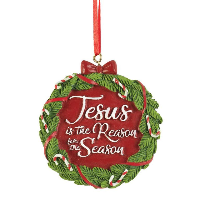 A pine wreath, decked out with ribbon and candy canes, is the border of this Jesus is the Reason for the Season ornament. Red hanging ribbon attached. Ornament is 3" diameter and made of resin.