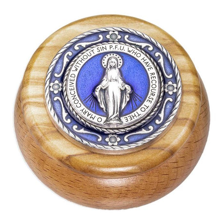 MIRACULOUS MEDAL WOOD & BLUE EPOXIED SILVER METAL KEEPSAKE BOX