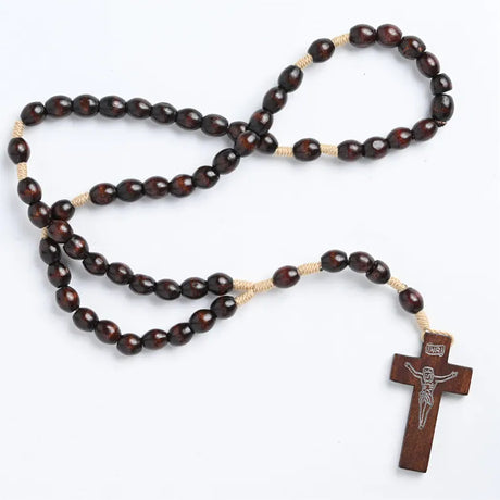Brown Wood Beaded Rosary with Corded String & Small Wooden Crucifix