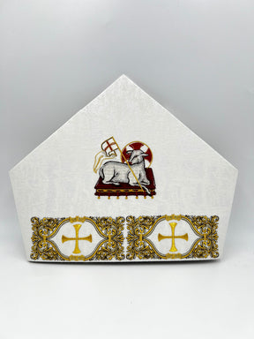 Mitra con El Cordero reposando en un cojin rojo con un banderin