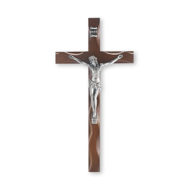 - 10" Deluxe Furniture Grade Solid Wood Notched Crucifix in a lacquered Walnut finish