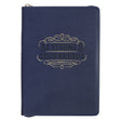 The Strong and Courageous Blue Faux Leather Journal with Zipper Closure is part of the Be Strong and Courageous Navy Collection, designed to celebrate graduates. This collection includes a scented candle in a glass jar, a metal keychain, a ceramic coffee mug, a spiral journal, a faux leather journal, and a stainless steel travel mug.