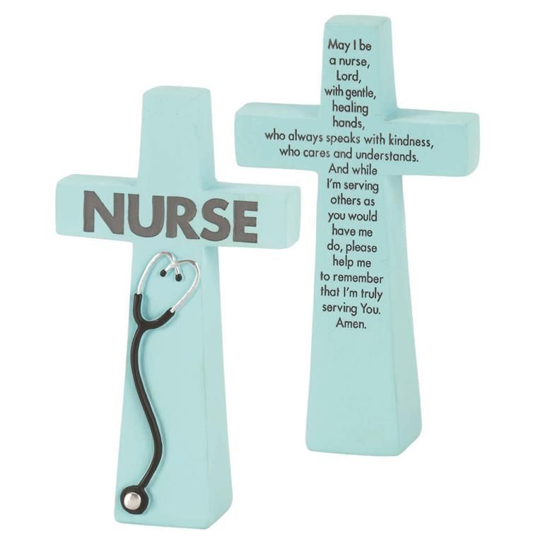 A Nurses Prayer Small Tabletop Cross Petite tabletop cross is a thoughtful and inspiring gift for any nurse. One side has a raised stethoscope design and the engraved word Nurse. Back side is engraved in black with a Nurses Prayer. Cross is 4 3/4" high, 2 5/8" wide, and 1" deep at base, tapering to 9/16" at top. Made of resin. Text of prayer: May I be a nurse, Lord, with gentle, healing hands, who always speaks with kindness, who cares and understands. And while Im serving others as you would have me do, please help me to remember that Im truly serving You. Amen. Verse by Robin Fogle copyright Dicksons