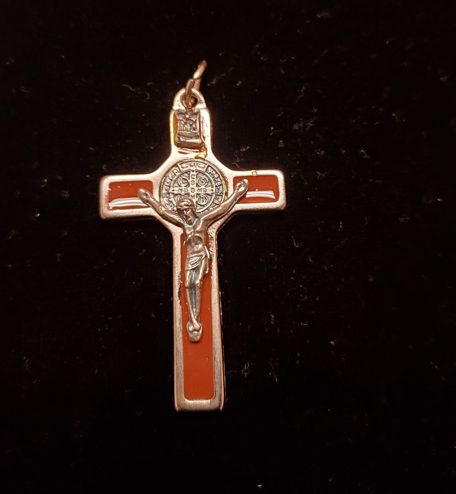 Medalla Cruz de San Benito Grande- acero inoxidable- color plateado y cafe-