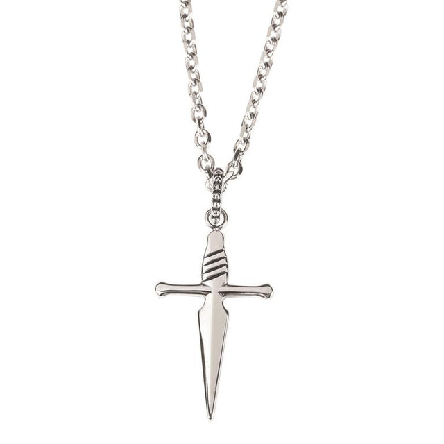 Unique sword cross design pendant is stainless steel; length is 1 1/2". The stainless steel chain is 24". Necklace comes in a deluxe black gift box.