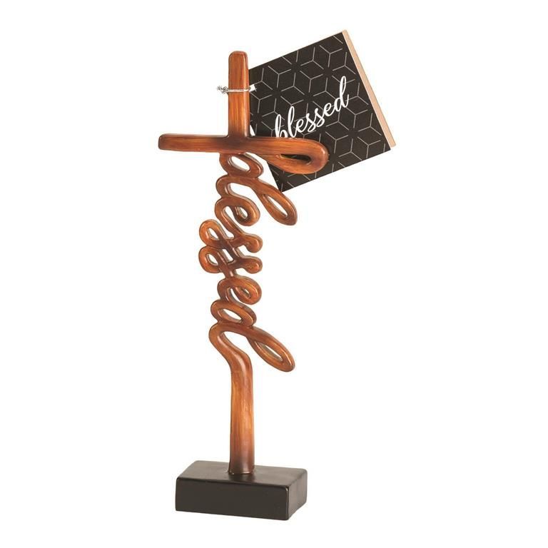 Blessed Tabletop Cross This unique cross incorporates the word "blessed" into its design. The attached folded tag also has the word "blessed" on front, and inside is the well-loved blessing from numbers 6:24-26, "The Lord bless you and keep you; the Lord make His face shine on you and be gracious to you; the Lord turn His face toward you and give you peace." Height of figure is about 7 3/8". The cross portion has a beautiful wood tone finish; base is black. Made of resin.