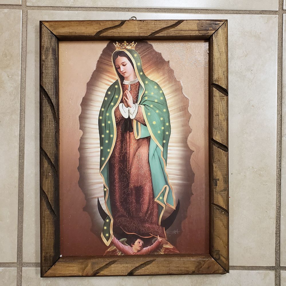 cuadro rustico de la virgen de guadalupe- cuerpo completo- fondo sencillo cafe