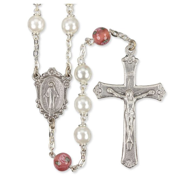 WHITE PEARL BEAD ROSARY WITH FLORAL OUR FATHER BEADS