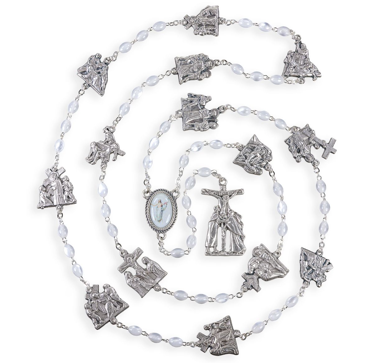 A beautiful, inspirational Lenten gift! Quality, fine White Faux Mother of Pearl Oval Bead 'Stations of the Cross' Rosary with 14 metal oxidized silhouette beads, each depicting the 'Stations of the Cross', and the 15th Station as the Crucifixion. Makes a beautiful gift for Easter, or treat yourself during Lent, and use at church during the 'Stations of the Cross'.